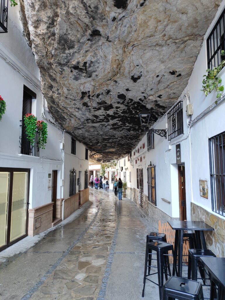 Najbardziej znane ulice, takie jak Calle Cuevas del Sol i Calle Cuevas de la Sombra, oferują zupełnie różne doświadczenia w zależności od pory dnia i nasłonecznienia. Jedna skąpana jest w słońcu, druga daje przyjemny cień, co doskonale oddaje kontrastowy charakter tego miejsca. Setenil urzeka kameralną atmosferą, spokojem i autentycznością — to idealny przystanek na krótki spacer, kawę lub tapas i chwilę wytchnienia od bardziej turystycznych tras Andaluzji.
